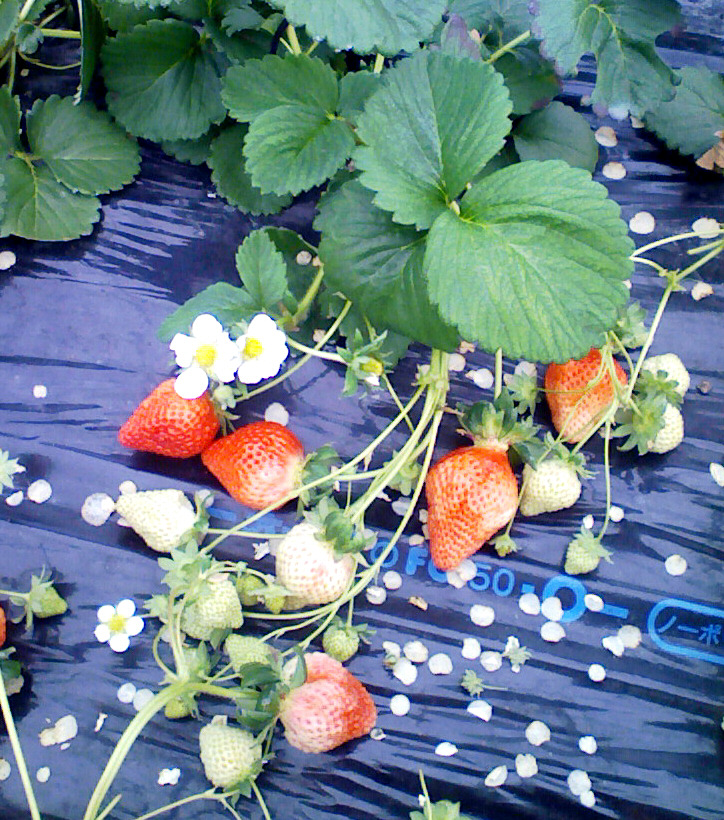 可憐な苺の花と、おいしそうな苺の実がごろごろしています。